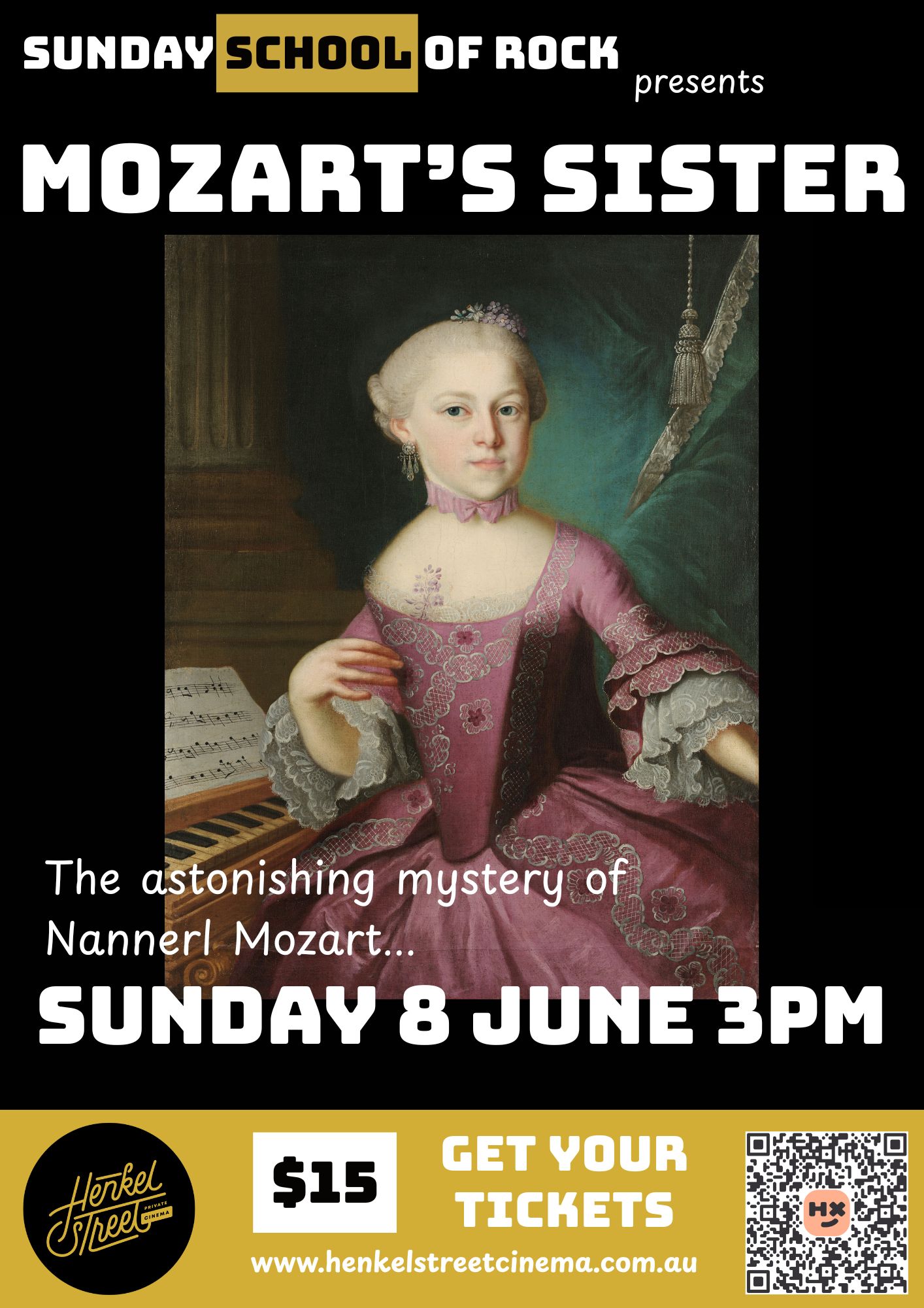 Sunday School of Rock has been pootling along happily at The Henkel Street Cinema. Enthusiastic lovers of concert films and music documentaries have been gathering on the second Sunday of the Month. Numbers ebb and flow but so far there seems to be a core group of movie goers finding the curatorial choices intriguing enough that they come to every session. Last months’ installment of Miss Nikki and the Tiger Girls is followed by Mozart’s Sister this month thereby continuing the theme of girl power and women kicking against the pricks… and stretching the definition of “rock” in the process.