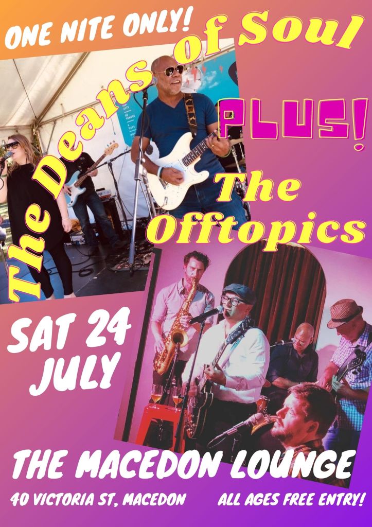 Both The Offtopics and Linc’s band The Deans of Soul will play for the good folk of the Macedon Ranges on the 24th of July.