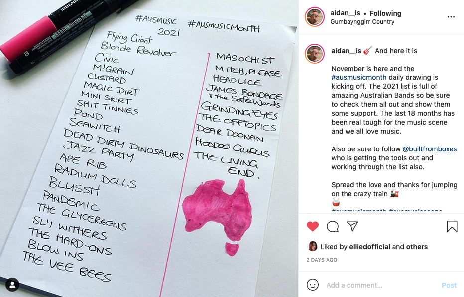 So what else has been going on? It hasn’t all been doom and gloom. In fact I was recently pretty chuffed to see that artist and illustrator Aidan Jarvis stuck us into his inspo list to drive his drawing through Oz Music Month. We’re amongst some legendary names there, and I’m pretty curious to see how my lines affect his lines.