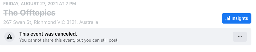 Firstly, let me apologize for the radio silence. Looking back I’m stunned to see that the last update was aaaaalllll the way back in late June. I suppose I could put a positive spin on it and say that we Offtopics take our commitment not to span our subscribers seriously, but the honest truth is, as George Harrison said, “it’s been a long, cold lonely winter”. The last mailout was full of optimism about future gigs and my efforts to fundraise for mental health and suicide awareness through doing LOTS of pushups. While we did get to play an absolutely amazing show at POME in late July, pretty soon we were packing up again and well on the way to making Melbourne’s the world’s longest lockdown. Our Macedon gig was postponed for the third time and our August, September and October POME shows were cancelled…