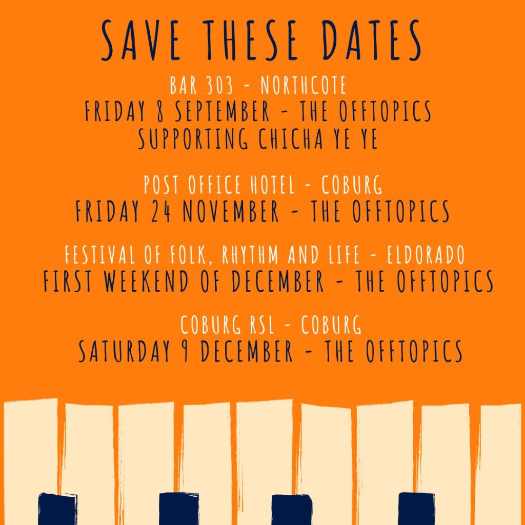 Ok, so maybe I’m not using that expression properly (inconceivable?) but I couldn’t think of anything else for the subheading. Yes, the band only has three more shows this year (and not until late November either) but an Offtopics newsletter wouldn’t be what it normally is without talking about a lot of other stuff that’s going on. And there’s a LOT to talk about. There’s non music stuff to talk about like my recent success coaching a fifth hockey Grand Final win for The Old Carey Hockey Club, there’s also the forthcoming Voice Referendum (spoiler: The Offtopics are all voting “Yes”), there’s an overdue reflection about the Comfort Music season at La Mama and then, there are all the “family gigs” by Offtopics players in their other bands. I’ll give them each a spruik at the end of the newsletter. So it’s not only our stuff that’s pouring into the chute for the last quarter of 2023.