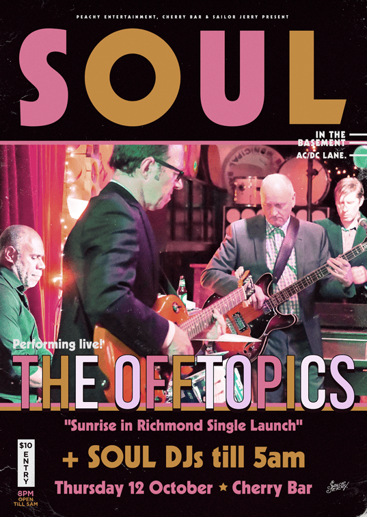 The Offtopics will play their signature blend of sexy soul and funny funk at Back Bar in Windsor. Full disclosure: this event has been organized by and for the polyamourous community of Melbourne. While no one in the band *ahem* “swings” that way we all believe in love. Who doesn’t right? Surely there’s no such thing as too much of a good thing, amirite??? The event organizer told us that this cocktail night is “safe for the general public as long as they are somewhat interested in socializing with people interested in open relationships.” If that sounds like your jam then we’ll be playing funky danceable songs from 10pm onwards. You can find out more and buy tickets here.